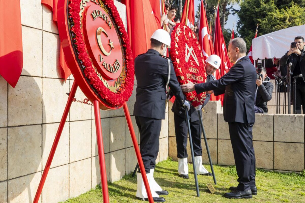 Cumhuriyet Meydanı’ndaki törende; Vali Toros, Tuğamiral Korkut Şen ve Başkan Seçer tarafından Atatürk Anıtı’na çelenk sunuldu. Çelenk sunma töreninin ardından saygı duruşunda bulunuldu ve İstiklâl Marşı eşliğinde şanlı Türk Bayrağı göndere çekildi. Mersin İl Milli Eğitim Müdürlüğü Maarif Halk Dansları Topluluğu tarafından sergilenen yöresel oyunlar ise gösteriye renk kattı. Ardından protokol konuşmalarına geçildi.