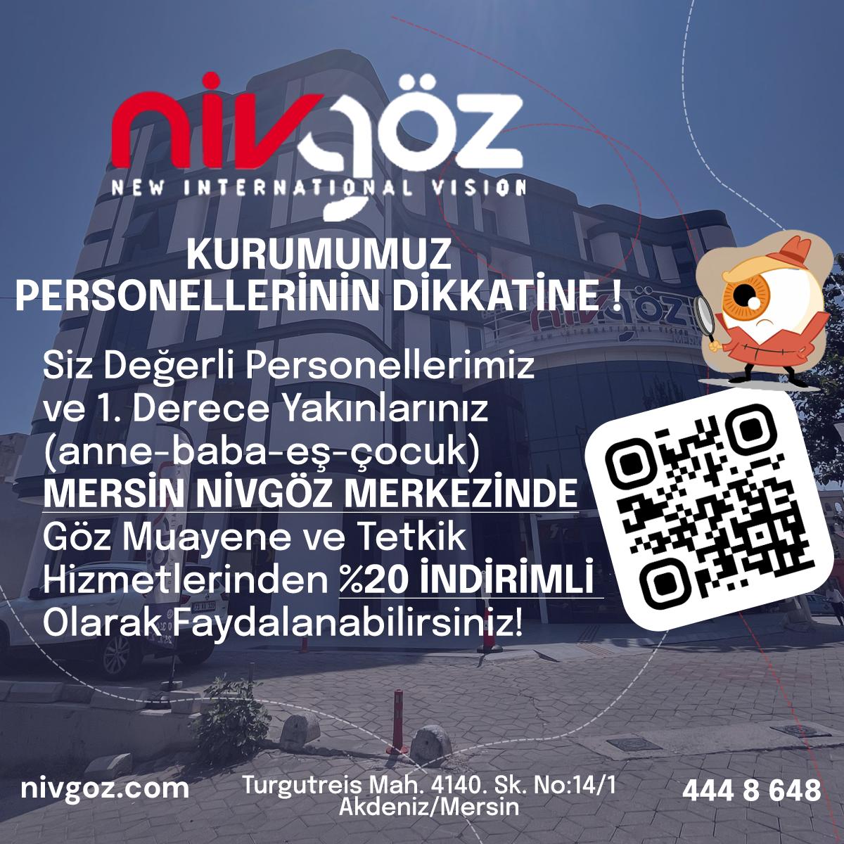 Ekim 13, 2025Personellerimiz ve 1. derece yakınlarına (Anne- Baba- Eş- Çocuk) Mersin NivGöz Merkezinde göz muayene ve Tetkik hizmetlerinden %20 olarak faydalanabilrisiniz.