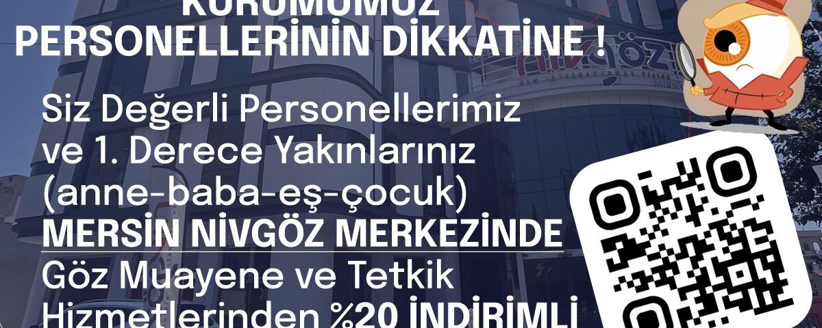 Ekim 13, 2025Personellerimiz ve 1. derece yakınlarına (Anne- Baba- Eş- Çocuk) Mersin NivGöz Merkezinde göz muayene ve Tetkik hizmetlerinden %20 olarak faydalanabilrisiniz.
